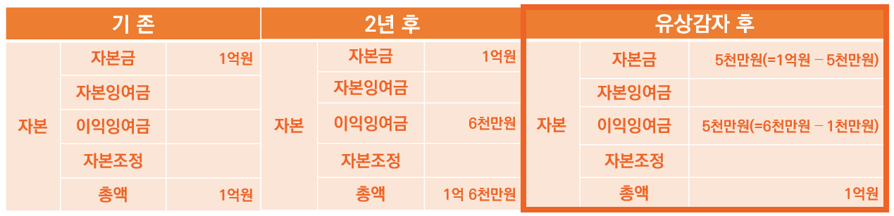 액면가 500원 x 소각된 주식 10만 주에 해당되는 5천만 원은 자본금에서 빠져나가므로 자본금은 기존 1억 원에서 5천만 원으로 감소합니다. 그리고 보상금 600원에서 액면가 500원을 뺀 100원에 소각된 주식 10만 주에 해당되는 1천만 원은 이익잉여금에서 빠집니다. 이럴 경우 자본금과 이익잉여금이 모두 빠져나가므로 자본 또한 1억 6천만 원에서 1억 원으로 줄어들게 됩니다.