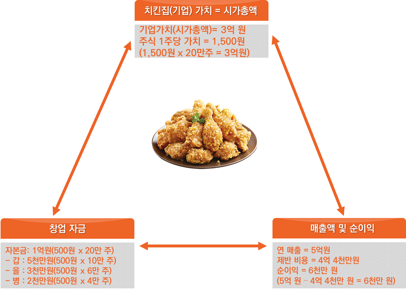 1년이 흘렀습니다. 자본금 1억 원과 은행 부채 등을 합쳐서 보증금 1억 원을 내고 나머지 돈으로 각종 재료와 집기(치킨 튀김기, 닭, 양념 등)를 구입했습니다. 나를 믿고 투자해 준 을과 병을 위해서라도 열심히 장사를 하니 어느덧 연매출 3억 원이 되었습니다. 직원들 인건비 및 각종 재료구입비 등등 이것저것 나가는 돈 2억 7천만 원을 빼니 3천만원의 순이익(연매출 3억 - 나가는 돈 2억 7천만원 = 3천만원)이 생겼습니다. 부동산에서 연락이 왔습니다. 위치도 좋고 단골 고객들도 있고 해서 2억 원을 받고 팔 수 있을 것 같다고 합니다. 액면가 500원의 주식 20만 주를 1,000원에 사겠다고 합니다. 이렇게 될 경우 기존에 투자금 1억 원보다 두 배 높은 2억 원 정도의 가치를 인정받았다는 생각이 들었습니다. 하지만 아직은 치킨집 운영이 좋기도 하고, 법인으로써 책임감을 가지고 일해야 하기 때문에 치킨집을 더 키우고 싶었습니다.