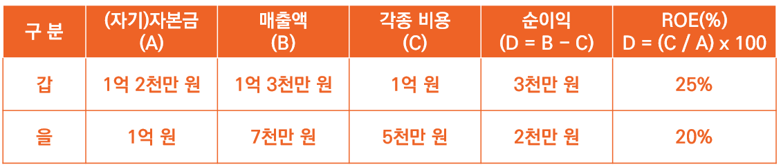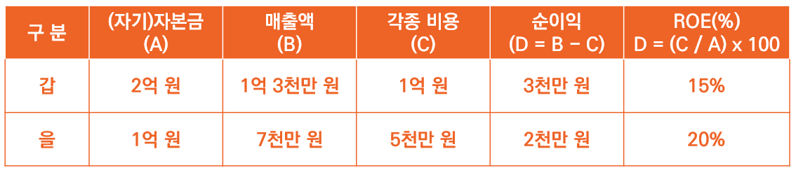 갑 치킨집의 ROE는 15%, 을 치킨집의 ROE는 20%입니다. 물론 순이익은 갑 치킨집이 을 치킨집보다 많습니다만 을 치킨집이 경영효율성이 보다 높다는 것을 알 수 있습니다. 이럴 경우 투자자들의 입장에서는 경영효율성이 높은 을 치킨집에 투자할 확률이 높겠지요.(물론 의사결정을 하는 다른 요소들도 많이 있습니다만 경영효율성 측면에서만 따질 때)
