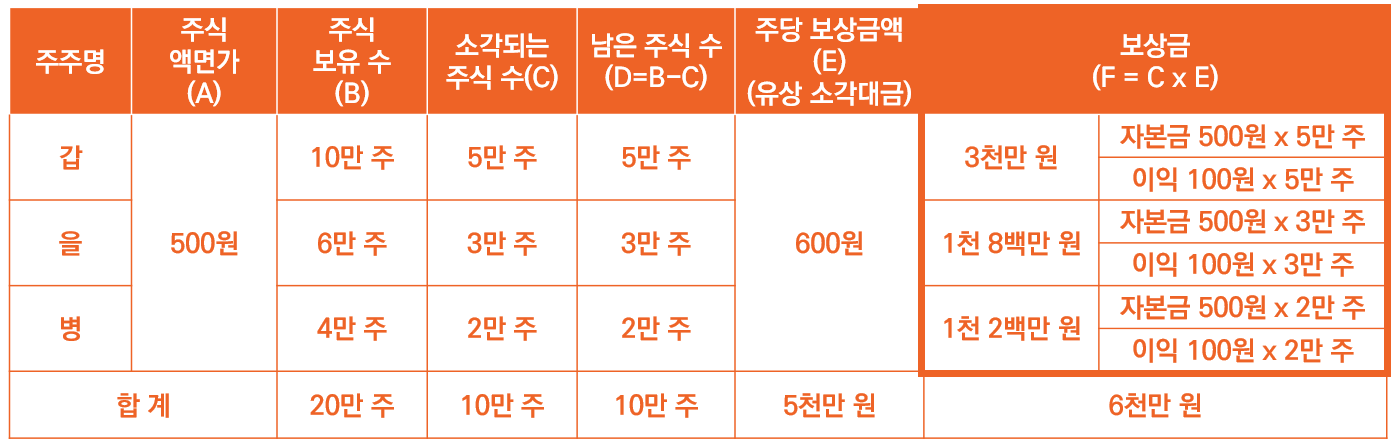 이런 상황에서 주주인 갑, 을, 병은 기존에 액면가 500원 x 보유 주식 수 만큼 투자하였는데 유상 소각대금 600원 x 소각하는 주식 수 만큼 보상을 받게 됩니다. 투자자들은 그렇다면 100원에 해당되는 금액(유상 소각대금 600원 - 액면가 500원) x 소각하는 주식 수 만큼의 이익을 얻게 되는 것입니다. 요약하면 아래와 같습니다.