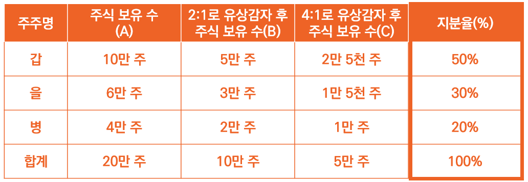결론적으로 이야기하면 이건 안 된다고 합니다. 모든 주주가 같은 비율로 감자를 실시해야 한다고 합니다. 따라서 20만 주를 10만 주로 줄일 때도 2:1의 비율로 줄여야 하고, 20만 주를 5만 주로 줄일 때도 4:1의 비율로 줄여야 한다고 합니다. 예를 들어 이런 식입니다.