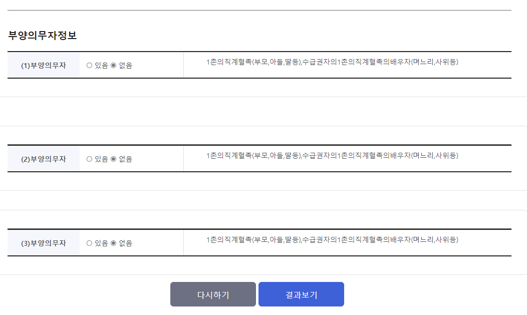 그리고 마지막에 부양의무자 정보를 입력한 후 '결과보기'를 클릭합니다.
