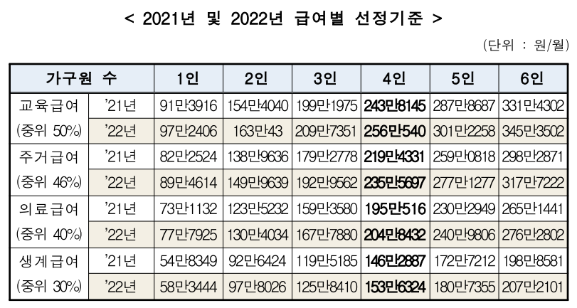 그리고 기준 중위소득을 근거로 생계급여, 의료급여, 주거급여, 교육급여를 선정하며 급여별 선정 기준은 생계급여는 30%, 의료급여는 40%, 주거급여는46%, 교육급여는 50% 이하 가구임을 확인할 수 있습니다. 4인 가구 기준 급여별 선정기준은 생계급여 153만 6,324원, 의료급여 204만 8,432원, 주거급여 235만 5,697원, 교육급여 256만 540원 이하이며, 2021년과 2022년 급여별 선정기준은 아래 표와 같습니다.