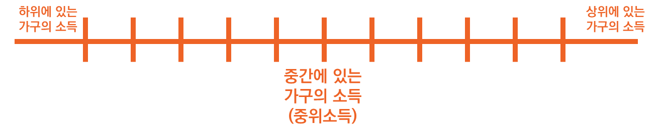 한 마디로 중위소득이란 모든 가구를 소득 순서대로 정렬시켰을 때 정확히 중간에 있는 가구의 소득이라는 의미인 것 같습니다. 그림으로 표현하면 이런 식이 아닐까 싶네요.