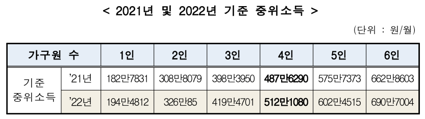 세부 내용을 보면 2021년과 2022년 기준 중위소득은 이렇게 되어 있습니다.