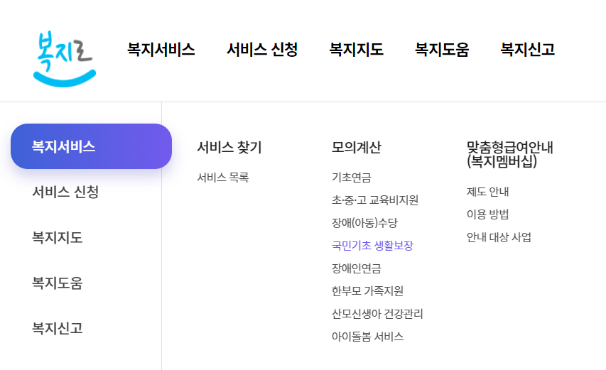 복지서비스 > 모의계산 > 국민기초 생활보장 메뉴를 클릭합니다.