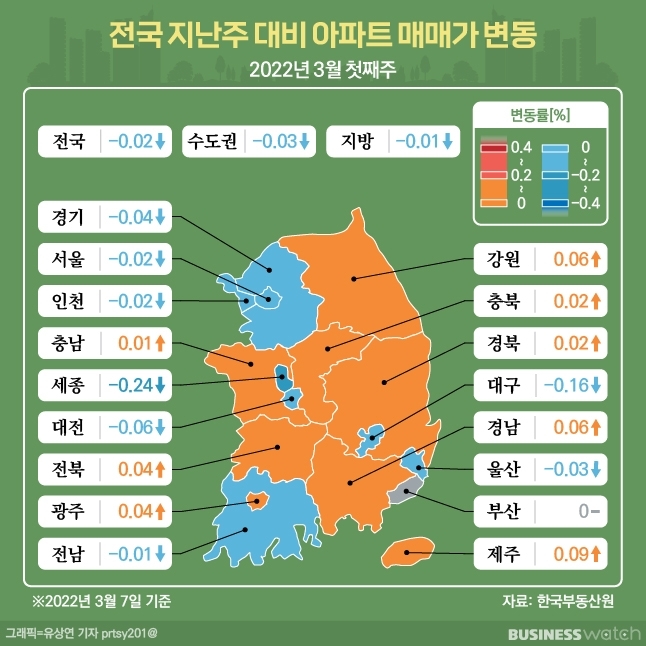한국부동산원 주간아파트가격 동향에 따르면 3월 첫째 주 전국 아파트 매매가는 -0.02%를 기록했다. 전주(-0.01%)보다 낙폭이 커졌다.