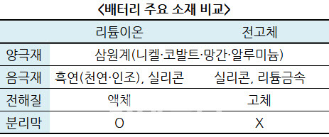 삼성SDI와 포스코그룹이 공략하는 전고체 배터리는 현재 전기자동차, 모바일 등에 적용되는 리튬이온 배터리의 4대 소재인 양·음극재와 분리막, 전해질 가운데 액체인 전해질을 고체로 바꿨다. 유기용매가 없어 화재 위험이 낮고 안전성이 높을 뿐 아니라 리튬금속 음극재 등을 적용해 전기차 주행거리를 늘리는 등 배터리의 에너지 밀도를 향상할 수 있다. 미래 배터리로 불리는 이유다.