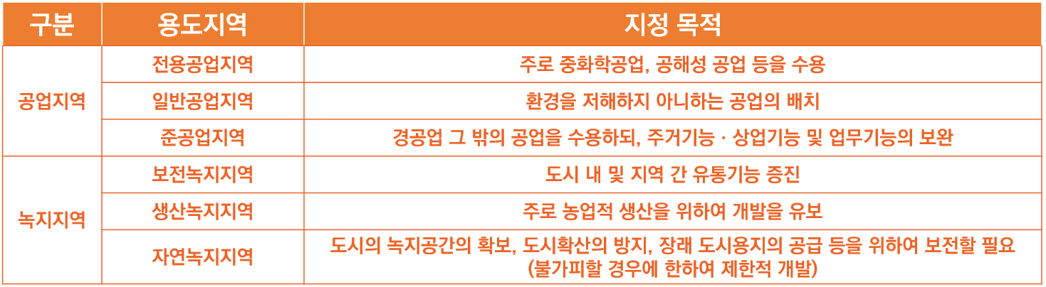 1. 도시지역: 인구와 산업이 밀집되어 있거나 밀집이 예상되어 그 지역에 대하여 체계적인 개발ㆍ정비ㆍ관리ㆍ보전 등이 필요한 지역