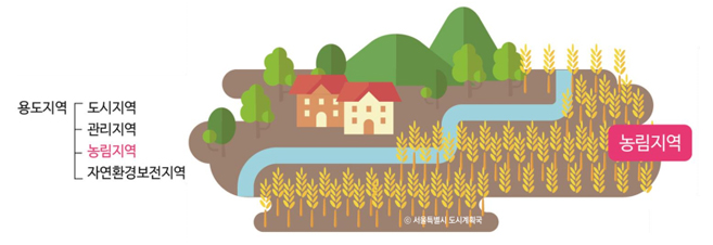앞에서 살펴본 국토의 계획 및 이용에 관한 법률 제6조에 의하면 농림지역은 도시지역에 속하지 아니하는 「농지법」에 따른 농업진흥지역 또는 「산지관리법」에 따른 보전산지 등으로서 농림업을 진흥시키고 산림을 보전하기 위하여 필요한 지역이라고 되어 있습니다. 쉽게 이해하면 농사를 짓는 곳, 산이나 언덕 같은 곳이라고 생각하면 될 것 같습니다.