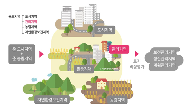 앞에서 살펴본 국토의 계획 및 이용에 관한 법률 제6조에 의하면 관리지역은 도시지역의 인구와 산업을 수용하기 위하여 도시지역에 준하여 체계적으로 관리하거나 농림업의 진흥, 자연환경 또는 산림의 보전을 위하여 농림지역 또는 자연환경보전지역에 준하여 관리할 필요가 있는 지역이라고 되어 있습니다. 쉽게 이해하면 무엇인가 관리가 필요한 지역입니다. 무언가를 보전해야만 하는 지역, 무엇인가를 생산하기 위해 특별히 관리가 필요한 지역, 여러 가지 이유로 계획적이고 체계적인 관리가 필요한 곳 정도라고만 이해하면 될 것 같습니다.