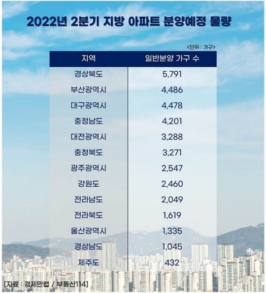 23일 부동산 정보제공업체 경제만랩이 부동산R114의 분양계획물량을 조사한 결과, 올해 2분기 4월부터 6월까지의 수도권 제외 지방 아파트 분양 계획 물량은 4만 8,545가구(민간 아파트 기준, 임대 아파트 제외)로 집계됐다. 이 중 일반 분양 계획물량은 3만 7,002가구다.