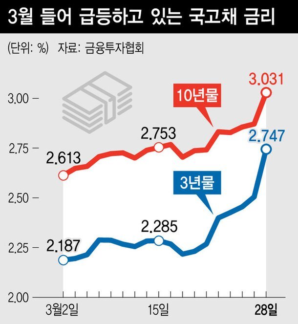 국고채 10년물 금리 7년반만에 3% 돌파…시장금리 ‘긴축 발작’