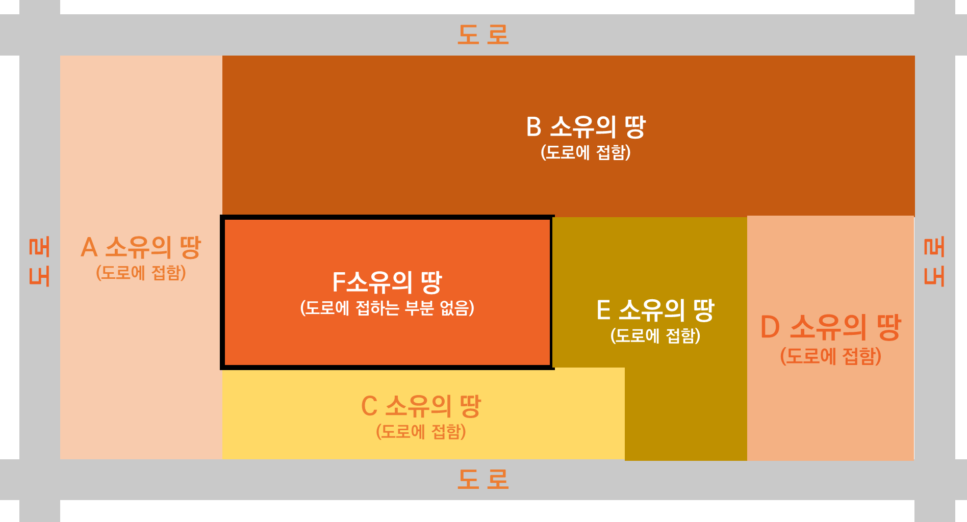 도로에 접해 있는 토지는 그렇다고 치고, 그렇다면 도로에 접해 있지 않은 토지도 있을 겁니다. 예를 들어 F소요의 땅 같은 상황입니다. A, B, C, D, E 소유의 땅에 둘러쌓여 도로와 접하는 면이 없습니다.