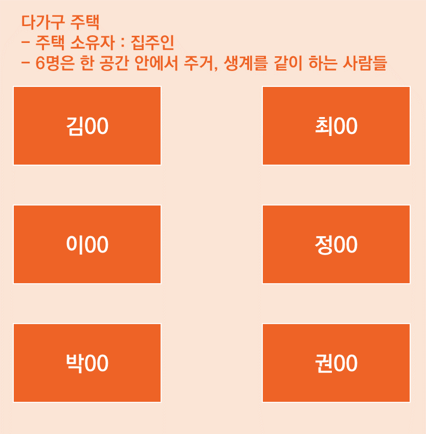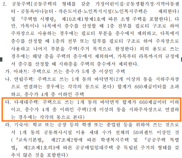 그렇다면 '다가구 주택'은 '쉐어하우스, 하숙집 등과 같이 주택의 소유권은 소유자 1명이 가지고 있고 나머지 사람들이 모여 살면서 주거와 생계를 같이하고 있는 형태' 정도로 이해할 수 있겠습니다.