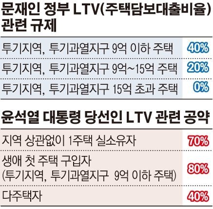 윤석열 당선인은 현재 지역별로 40~60%로 차등 적용된 주택담보인정비율(LTV)을 지역과 상관없이 1주택 실수요자는 70%, 생애 최초 주택구매자는 80%까지 완화하는 공약을 내놨다. 다주택자의 경우 보유 주택 수에 따라 LTV를 40% 이하로 적용할 방침이다.