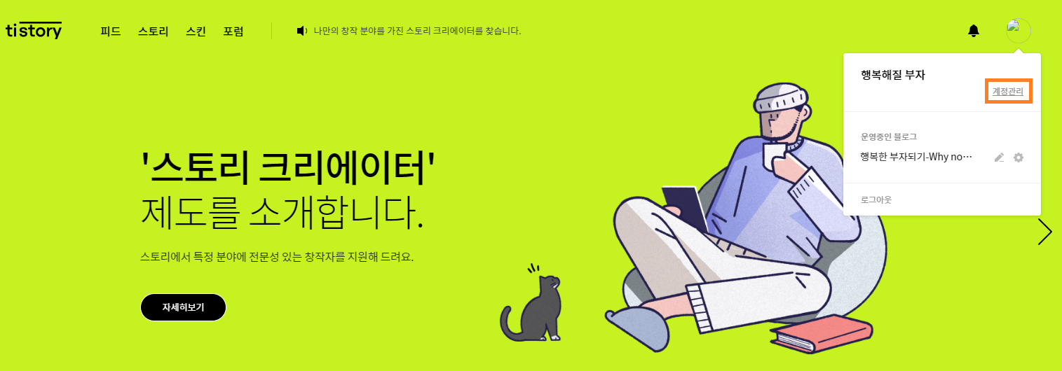 만약 같은 계정으로 블로그를 하나 더 운영하고 싶다면 티스토리 블로그에 로그인 후 '계정관리' 메뉴를 클릭한 후,