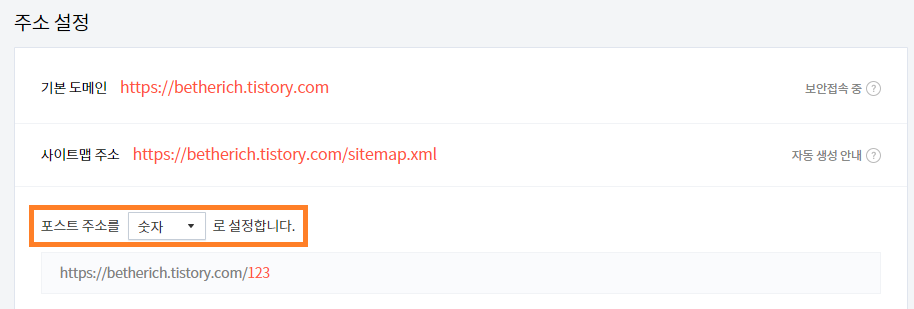 주소 설정의 경우 포스트 주소를 '숫자', '문자'로 설정할 수 있다고 합니다.