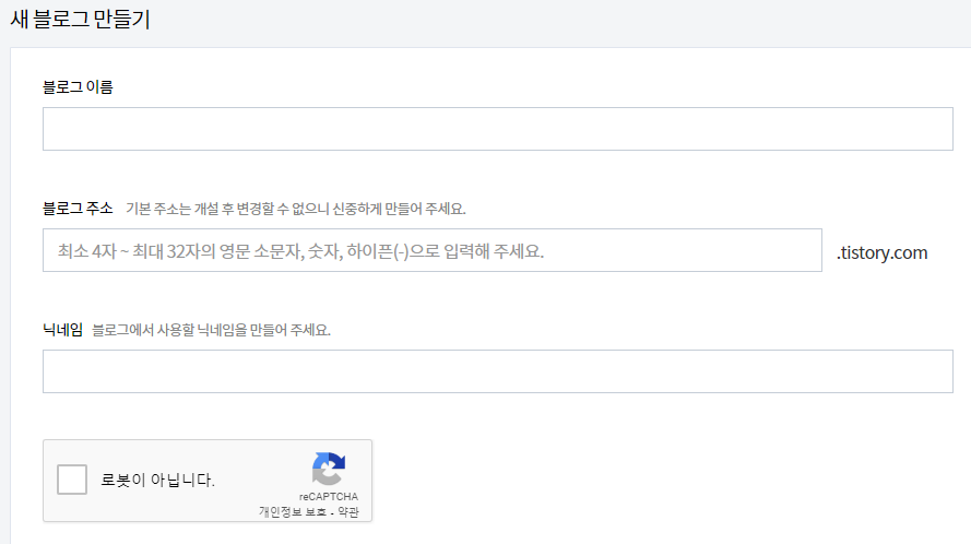 블로그 이름과 주소, 닉네임을 정한 후 입력하고 '로봇이 아닙니다'를 체크한 후 개설하면 됩니다.