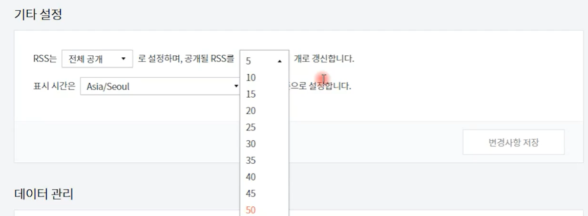 기타 설정에 있는 RSS는 무조건 전체 공개하는 것이 좋다고 합니다. 사이트 등록을 했을 때 포털에서 글을 읽어가는 기준이 RSS와 사이트맵이고 '공개될 RSS숫자'는 포털이 동시에 수집할 수 있는 글의 개수를 의미하기 때문에 최대 개수인 50개로 설정하면 된다고 합니다.