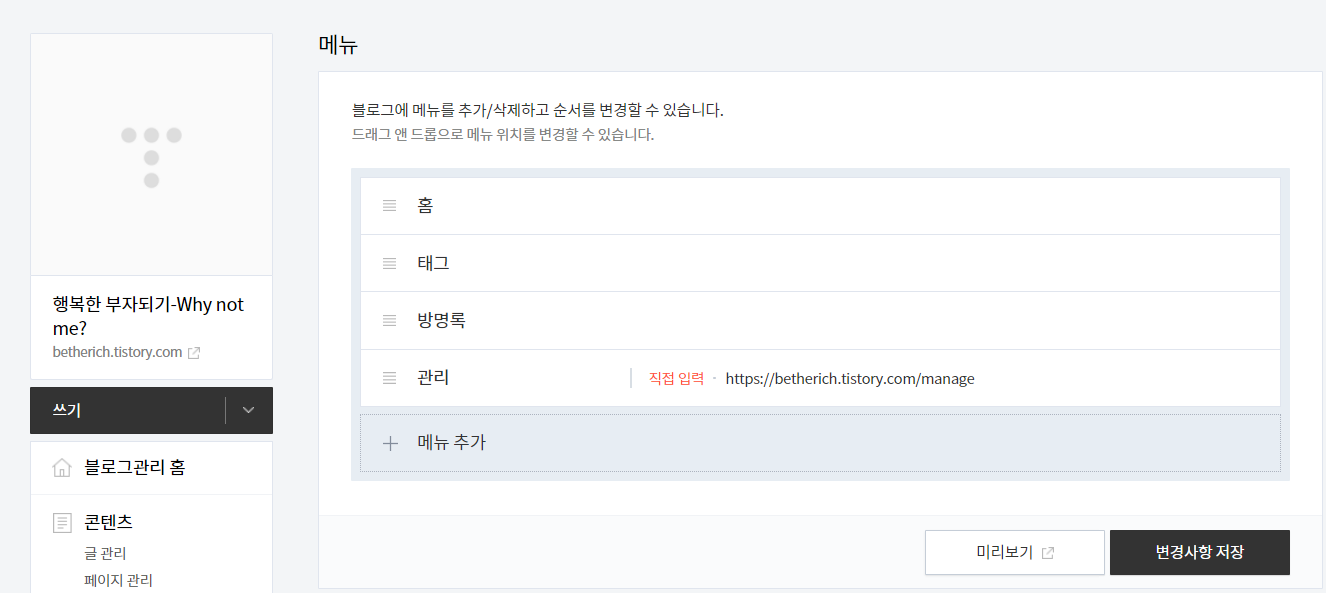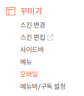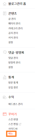 그리고 [관리자]로 보다 편리하게 들어가기 위해 [꾸미기] - [메뉴]로 들어가 [메뉴 추가]를 누르고 관리자 주소를 입력할 경우 보다 쉽게 들어갈 수 있습니다.