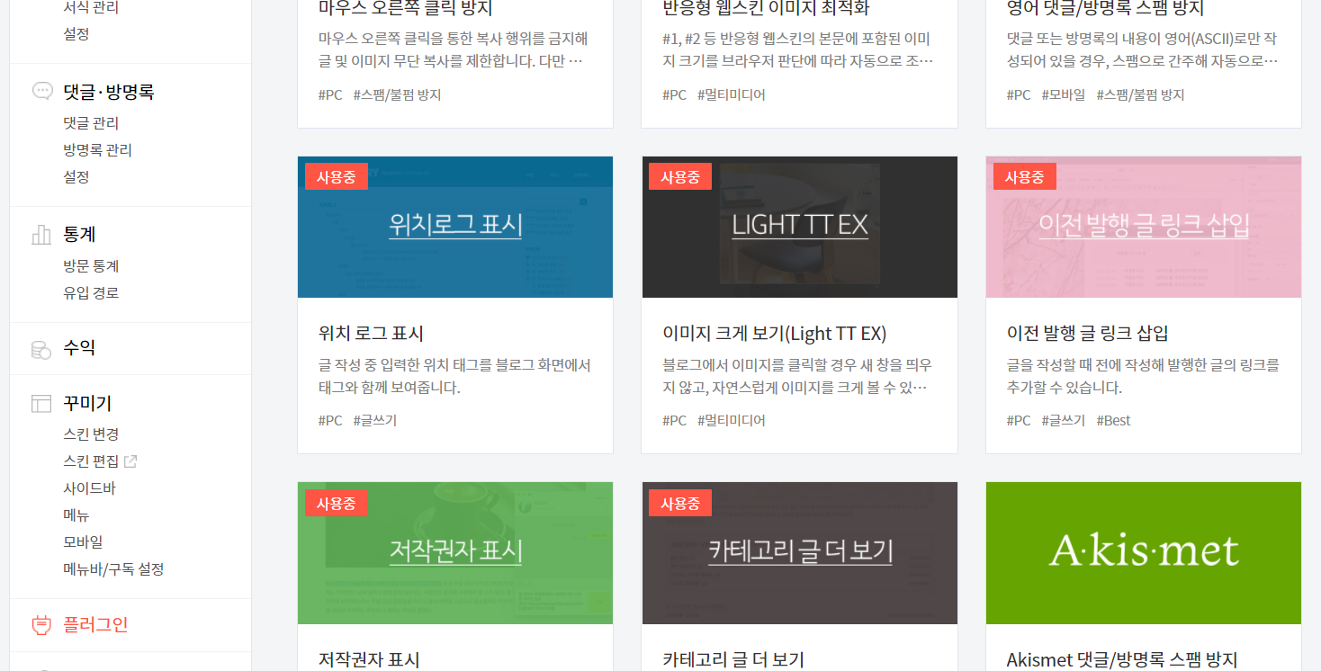 플러그인 설정에서는 티스토리에서 만든 다양한 기능을 추가할 수 있습니다. '반응형 웹시킨 이미지 최적화'의 경우 컴퓨터나 모바일 등 기기에 맞게 사진 크기를 자동으로 조절해 주는 기능이기 때문에 적용해 주는 것이 좋을 것 같습니다. 마우스 오른쪽 클릭 방지 등도 유용한 기능이구요. 그 밖에 개인적으로 이용하고 싶은 게 있다면 사용하면 됩니다.