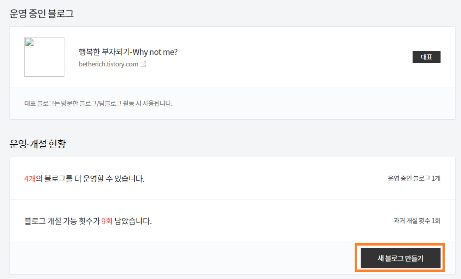 티스토리는 계정 한 개 당 최대 10번의 블로그를 만들 수 있습니다. 만약 블로그 4개를 만들고 폐쇄했다면 6개를 더 만들 수가 있다는 의미입니다. 그리고 최대 5개까지 동시에 운영할 수 있습니다.