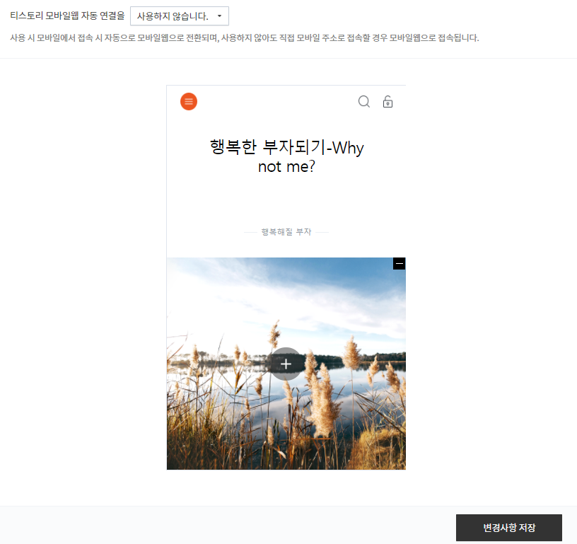 모바일 설정에서는 [꾸미기] -[모바일] - [티스토리 모바일웹 자동 연결을 사용하지 않습니다] 라고 반드시 바꾸어야 합니다. 스킨 종류와 상관없이 모바일에서 똑같이 보이도록 하는 기능인데 지금은 대부분의 스킨이 기기 사이즈에 최적화되기 때문에 이 기능을 사용하지 않는 게 좋다고 하며, 대표적으로 광고가 제대로 출력이 안되는 경우가 발생한다고 합니다.