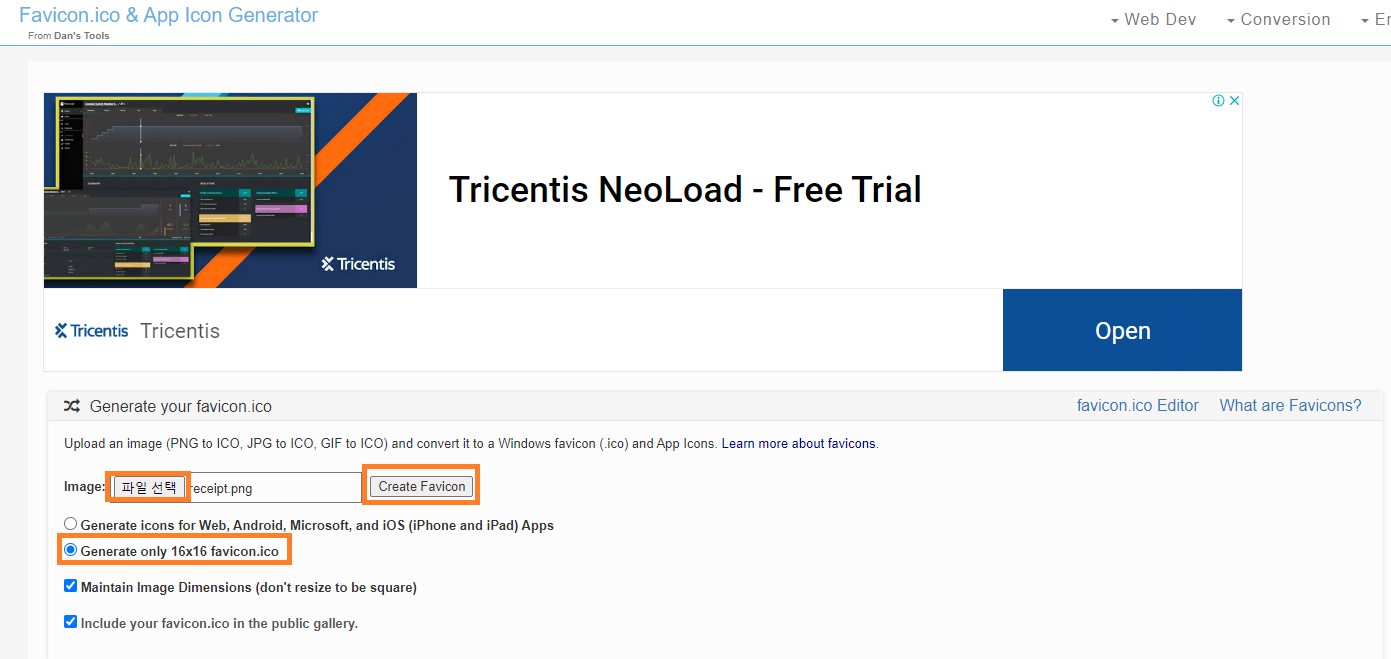 해당 사이트로 들어가서 파일 선택을 클릭한 후 파비콘으로 만들고 싶은 이미지를 불러오고 16x16을 클릭한 후 create favicon을 누르면 파일을 다운로드할 수 있고 파비콘이 생성되면 이걸 업로드하면 됩니다.