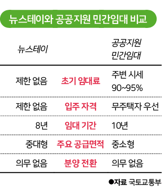 이를 두고 송영길 전 더불어민주당 대표는 "총 12개 사업의 이익 4조8,000억 원을 민간이 독식하는 걸로 돼 있다"고 꼬집기도 했습니다. 결국 뉴스테이는 건설사 특혜, 서민에게 버거운 임대료 등의 부작용을 이유로 공공성을 높인 공공지원 민간임대로 바뀌게 됐습니다. 공공지원 민간임대주택은 주변 시세의 90~95% 수준 초기 임대료로 무주택자에게 우선 공급됩니다. 공급물량의 20% 이상은 청년, 신혼부부 등 주거지원계층에 특별공급되고 거주 가능 기간은 10년까지 늘어났습니다.