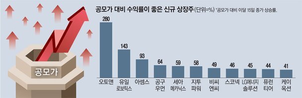 지난 15일 종가를 기준으로 오토앤 주가가 공모가 대비 280% 오른 것을 비롯해 유일로보틱스(143%), 아셈스(93%), 공구우먼(64%), 세아메카닉스(59%), 지투파워(58%) 등이 공모가 대비 50% 넘는 수익률을 기록했다. LG에너지솔루션도 공모가 대비 45% 수익권이다. IPO 시장 침체 속에서도 꼼꼼한 종목 선별을 통해 수익을 얻을 기회가 여전히 많았다는 평가가 나오는 이유다.