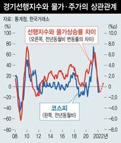 선행지수 변동률과 소비자물가 상승률의 차이로 주가 방향을 전망해볼 수 있다. 2008년 1월에서 2022년 3월 사이의 통계로 분석해보면 이들 사이에는 상관계수가 0.71로 상당히 높게 나왔다.지난해 하반기 이후 선행지수와 물가 차이가 급격하게 줄어들었는데, 이는 선행지수가 하락하고 물가는 상승했기 때문이었다. 이 시기에 코스피도 같이 떨어졌다.
