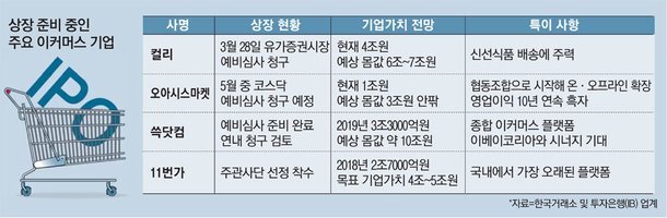 IB 업계에선 두 회사의 상장 행보를 넘어 이커머스 산업 자체에 주목하기 시작했다. 대기업 그룹사인 쓱닷컴과 11번가도 코스피 상장을 준비 중이어서다. 특히 쓱닷컴은 지난해 10월 주관사를 선정한 뒤 연내 증시에 입성하고자 막바지 준비를 펼치고 있다. 쓱닷컴은 신세계그룹에서 이커머스 부문을 총괄 중이며 컬리, 오아시스마켓과 달리 다양한 품목을 골고루 취급하는 종합 플랫폼이다. 전체 매출에서 라이프스타일과 식료품의 비중은 각각 60%, 40% 정도로 알려져 있다. 국내 증권사 애널리스트들이 전망하는 쓱닷컴의 예상 기업가치는 10조원 안팎이다. 쓱닷컴 관계자는 "목표로 하는 기업가치를 인정받을 수 있는 시점을 고심 중"이라며 "예비심사를 청구하기 위한 준비는 어느 정도 마쳤으며 시장이 안정되는 것이 관건"이라고 말했다.