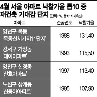 실제로 목동신시가지11단지를 포함해 낙찰가율이 높은 서울 아파트 10위권 내 4개 단지가 준공연도 30년을 바라보고 있다. 4위 강서구 가양동 대아아파트는 1993년, 5위 양천구 신정동 신호아파트는 1997년에 각각 준공됐다. 1995년 준공된 노원구 상계동 상계신동아도 재건축 기대감이 있는 투자자들이 응찰에 뛰어들며 낙찰가율이 높게 책정돼 6위에 올랐다. 이들 4개 단지의 평균 낙찰가율은 117.05%로 4월 평균 낙찰가율(105.10%)을 웃돈다. 평균 낙찰가율은 지난 2월(97.30%), 3월(96.30%) 두 달째 100%를 밑돌다가 지난달 100%대로 반등했다.