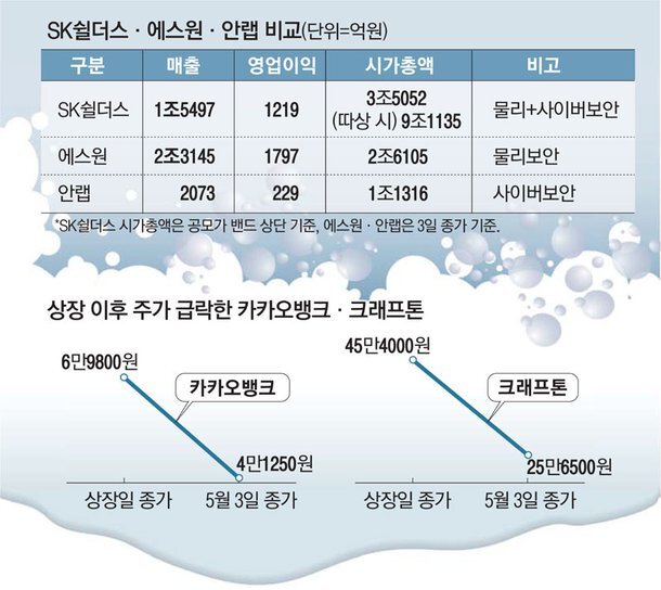 이달 상장할 예정인 SK쉴더스가 유가증권시장(코스피) 데뷔와 동시에 보안주 시가총액 1위를 차지할 것으로 예상되는 가운데 공모가 고평가 논란이 뜨겁다. 지난해 카카오뱅크와 크래프톤이 각각 금융주·게임주 시가총액 1위로 화려하게 데뷔했지만 이후 주가가 내리막을 탄 사례가 있기 때문이다.