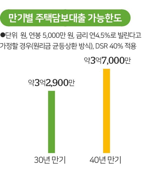 연소득 5,000만 원의 직장인 A씨가 연 4.5%(원리금 균등상환)로 주담대를 이용할 경우를 가정해보겠습니다. DSR 40% 적용에 따라 만기가 30년일 때 A씨는 최대 3억2,900만 원가량만 대출이 가능합니다. 물론 다른 대출이 없는 상황을 가정했을 때입니다. 그런데 만기를 40년으로 늘리면 A씨의 대출 한도는 3억7,000만 원까지 늘어납니다. 주택자금 마련에 애를 먹고 있는 대출자에게 약 4,000만 원가량의 숨통이 추가로 트이는 겁니다.