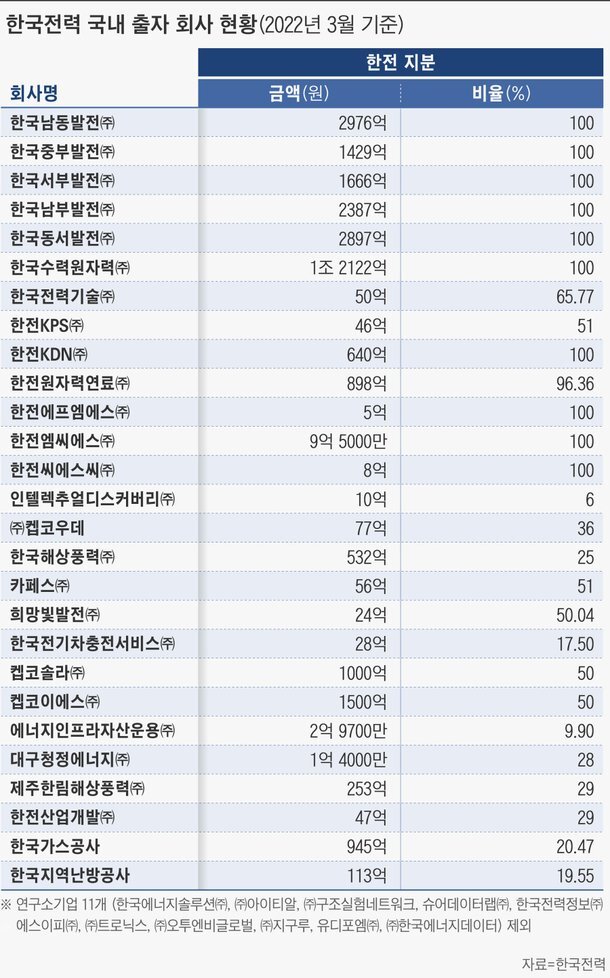 먼저 한전은 보유 중인 출자 지분 중 공공성 유지를 위한 최소한의 지분을 제외하고 매각을 추진하기로 했다. 지난 3월 기준 현재 한전은 국내 총 27개 회사에 2조9723억원을 출자하고 있다. 6개 발전자회사의 경우 지분 100%를 보유하고 있는데, 출자 금액은 2조3477억원으로 전체 출자 현황의 대부분을 차지한다. 보유 부동산 역시 매각 가능한 모든 부동산을 매각한다는 원칙 하에 제로 베이스에서 매각대상을 발굴하기로 했다. 다만 어느 출자 지분과 부동산을 얼마나 팔지는 아직 결정되지 않았다. 한전 관계자는 “전력사업이 가능한 수준까지만 남기고 모두 판다는 뜻”이라고 설명했다.