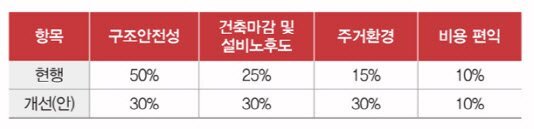 안전진단 평가 항목 조정은 윤석열 대통령의 공약사항이 그대로 반영될 것으로 보인다. 윤 대통령은 구조안전성 비중을 현행 50%에서 30%로 대폭 낮추는 대신 주거환경 비중은 15%에서 30%로 끌어올리는 조정안을 공약으로 제시했다.