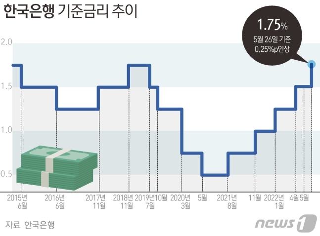 한은의 정책결정기구인 금융통화위원회는 26일 정례회의를 열고 기준금리 0.25%p 인상을 결정했다. 우리나라 기준금리는 9개월 만에 0.50%에서 1.75%로 오르게 됐다.