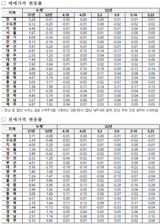 수도권은 -0.02%로 지난주 수준을 유지했다. 인천과 경기는 각각 이번 주 -0.05%, -0.03%를 기록했다. 경기에서도 이천시(0.25%)는 정주여건이 양호한 송정, 창전동 중저가 위주로, 고양 일산서구(0.10%)와 일산동구(0.06%)는 재건축 규제완화 기대감 등으로 상승했으나, 시흥시(-0.18%), 화성시(-0.15%), 의왕시(-0.11%), 용인 수지구(-0.09%) 등은 하락 폭이 커졌다.