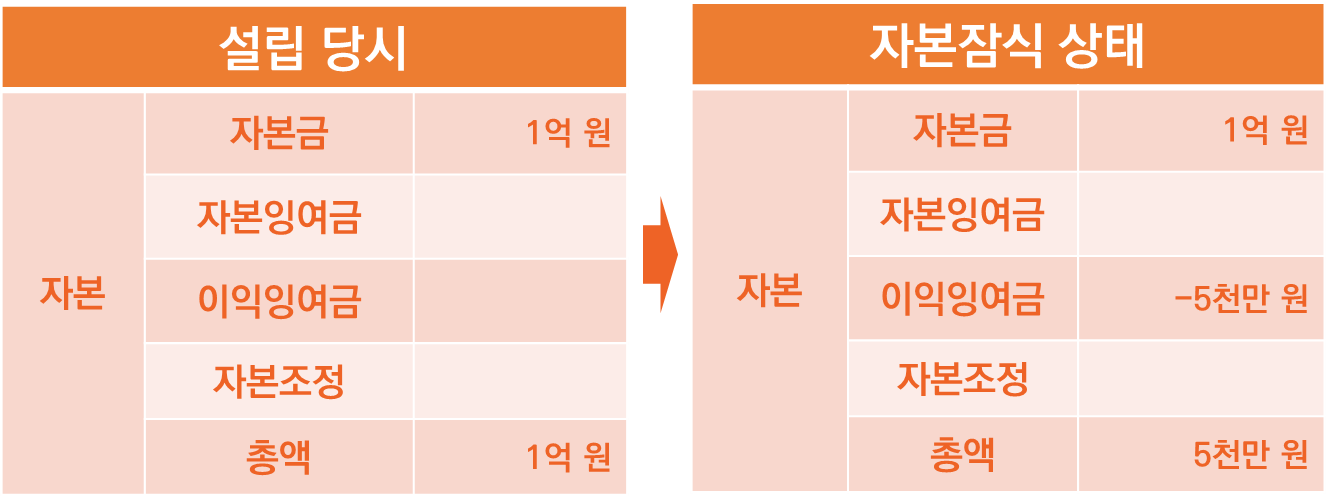 예를 들어 보겠습니다. 설립 당시 자본금 1억 원으로 시작했고 자본 총액은 1억 원입니다. 하지만 5천만 원의 손실로 인해 자본 총액(5천만 원)이 자본금(1억 원)보다 작은 상태인 자본잠식 상태가 되었습니다.