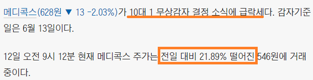 전일 대비 21.89%, 25.91%...떨어지는 폭도 상당합니다. 여러 가지 다양한 상황들이 있을 수 있겠지만 일단 무상감자는 악재이며, 주가에 부정적인 영향을 미친다고 생각하면 될 것 같습니다.