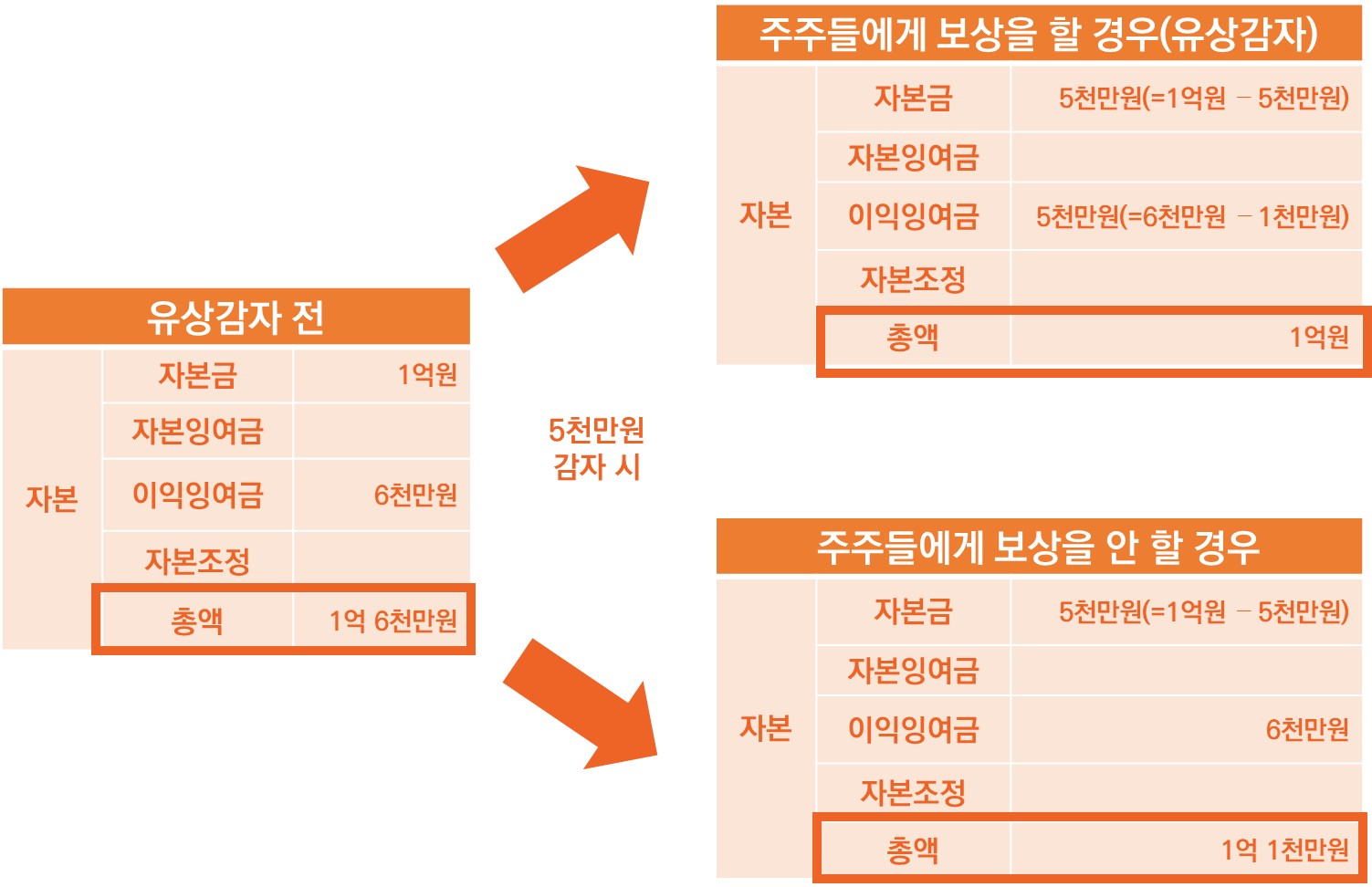 3. 무상감자는 자본금은 감소하지만 자본총액은 변하지 않는 형식적 감자, 유상감자는 자본금도 줄어들고 자본총액도 줄어드는 실질적 감자다.