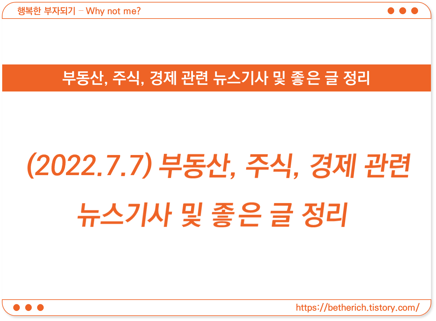 | (2022.7.3) 부동산, 주식, 경제 관련 뉴스기사 및 좋은 글 정리 (0) | 2022.07.03 |