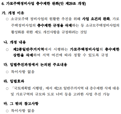 다양한 내용들이 있지만 이 중에서 '가로주택정비사업 층수제한 완화(안 제29조 개정)' 관련하여 '제2종일반주거지역에서 시행하는 가로주택정비사업의 층수제한 상한을 삭제하여 지역 여건에 따라 정할 수 있도록 함'이라고 되어 있습니다.