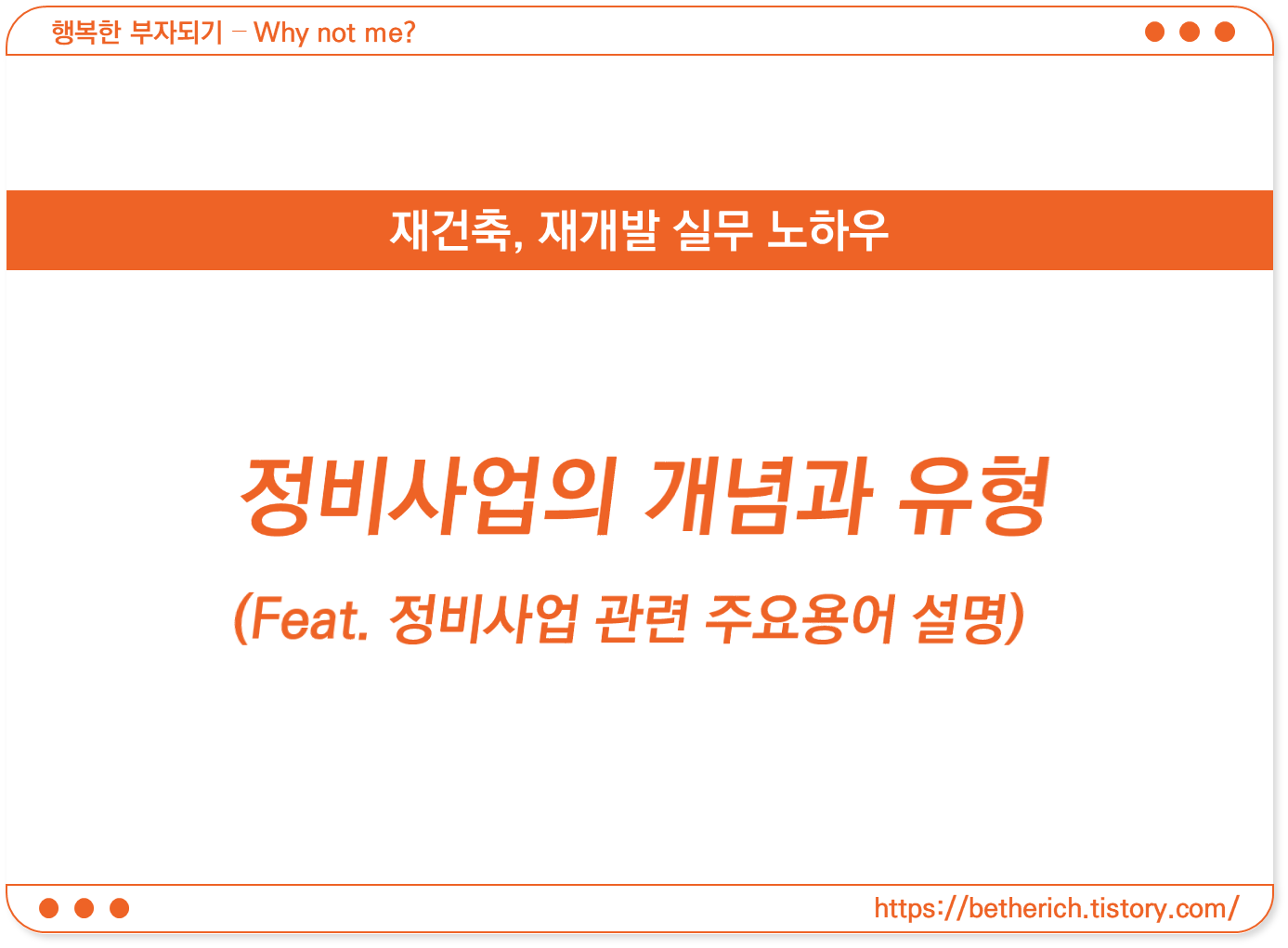 정비사업의 개념과 유형에 대하여 간략하게 살펴보았습니다. 우리가 일반적으로 이야기하는 재개발, 재건축 같은 것들은 '정비사업'에 속하고, 해당 사업은 일반적으로 '도시 및 주거환경정비법(약칭 : 도시정비법)'에 명시되어 있다 정도로만 이해하면 될 것 같습니다.