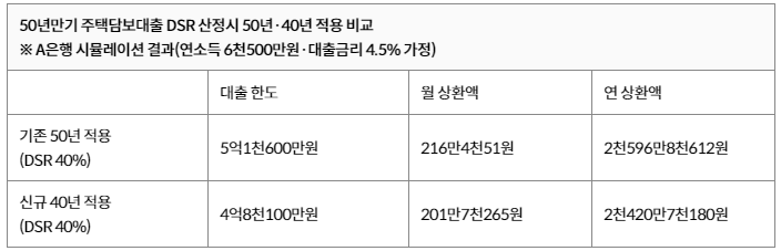 이 대출자가 만약 50년 만기 주택담보대출을 받고 기존 방식대로 DSR 산정 과정에서 만기 50년이 모두 인정되면, 대출 금리 4.5%를 기준으로 빌릴 수 있는 50년 만기 주택담보대출은 최대 5억1천600만원이다. 이때 월 상환액은 216만4천51원, 연 상환액은 2천596만8천612원으로 DSR은 약 40%가 된다.