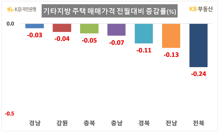 수도권(0.0%)은 전월대비 보합이다. 5개 광역시(-0.16%)는 하락했고 기타지방(-0.07%)도 하락폭이 줄었다. 수도권에서는 경기가 +0.05% 상승, 인천 -0.12%은 하락했다. 서울(-0.04%)은 하락폭이 대폭 축소되면서 보합권에 근접했다.