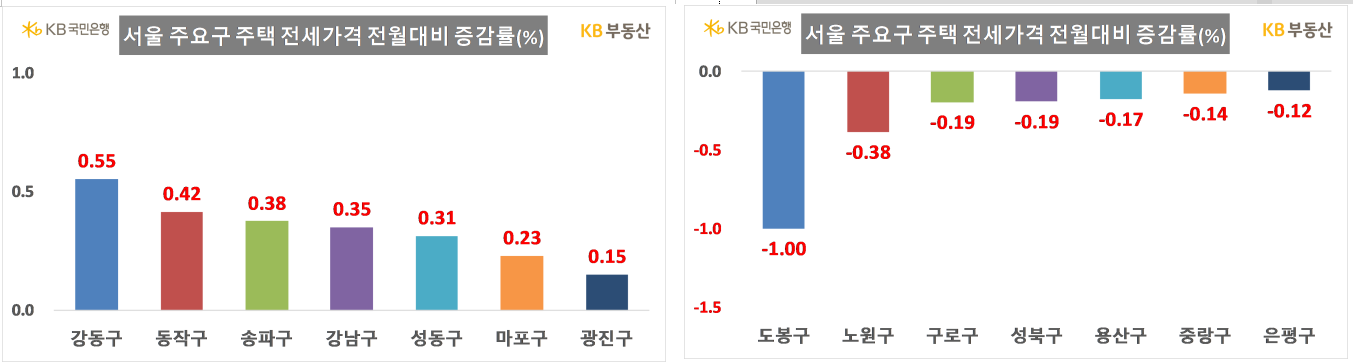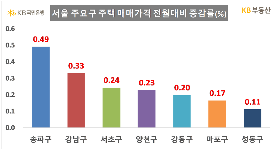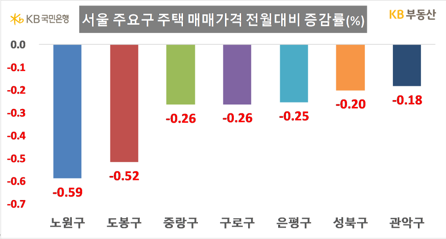 서울 주택 매매가격은 전월 대비 -0.04% 하락했다. 노원구(-0.59%), 도봉구(-0.52%), 중랑구(-0.26%), 구로구(-0.26%), 은평구(-0.25%) 등 하락했고 송파구(0.49%), 강남구(0.33%), 서초구(0.24%), 양천구(0.23%)는 상승했다.
