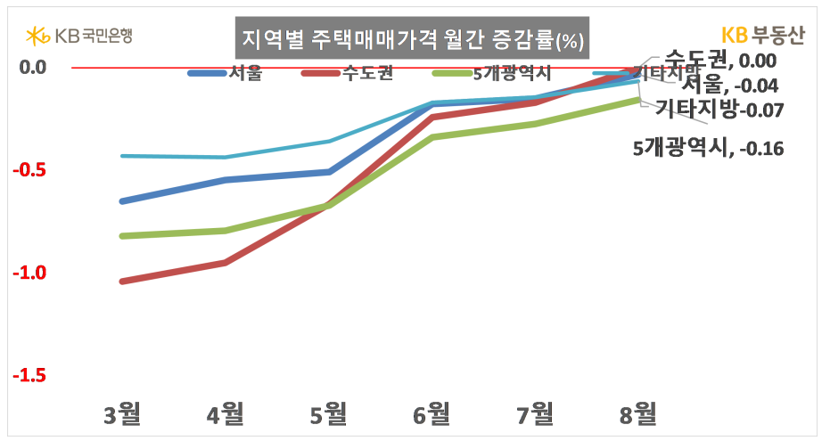 서울 아파트는 -0.06%로 소폭 하락했다. 연립주택이 -0.02% 하락, 단독주택은 0.0% 보합을 보였다.(서울 아파트 매매 변동률 -1.17%(3월) -0.97%(4월) -0.87%(5월) -0.28%(6월) -0.23%(7월) -0.06%(8월))